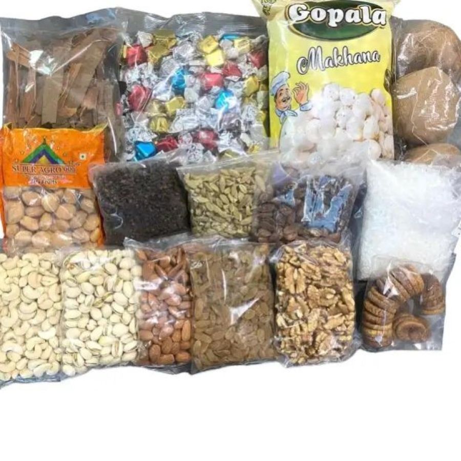 REUEL BHAITIKA SPECIAL DRY FOOD COMBO-1 1. CASHEW NUT ( KAJU)_200GM 2. ALMOND (BADAM)_ 200GM 3. PISTACHIO (PISTA)_ 200GM 4. RAISIN (KISMIS)_ 200GM 5. DRY COCONUT (NARIWAL)_500GM 6. WALNUT KERNELS ( OKHAR GUDI) _200GM 7. APRICOT ( KHURPANI )_250GM 8. DRY FIG (ANJIR)_ 200GM 9 .FOX NUTS (MAKHANA)_250GM 10. CLOVES (LWANG)_ 100GM 11. CARDAMOM (SUKUMEL)_50GM 12. BLACK CARDAMOM ALAICHI)_100GM 13. CINNAMON STICK (DALCHINI)_200GM 14. CRYSTAL SUGAR (DANA MISHRI)_200GM 15. MIX ASSORTED CHOCOLATE_500GM TOTAL WEIGHT : 3.30KG GOOD QUALITY_FRESH AND HYGHINE_KEEP IN COOL AND DRY PALCE_ALL TOTAL 17 ITEMS INCLUDED_PRICE AS PER WEIGHT -NOTE: This is whole coconut so inside no guarantee.